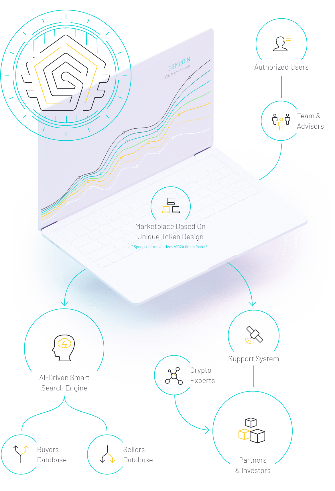 GGemCoin is a block chain based marketplace, where buyers and sellers meet to carry out operations involving digital goods and assets with crypto currency transactions. The unique advantage here is an automatic matching of users, basing on straight AI approach.